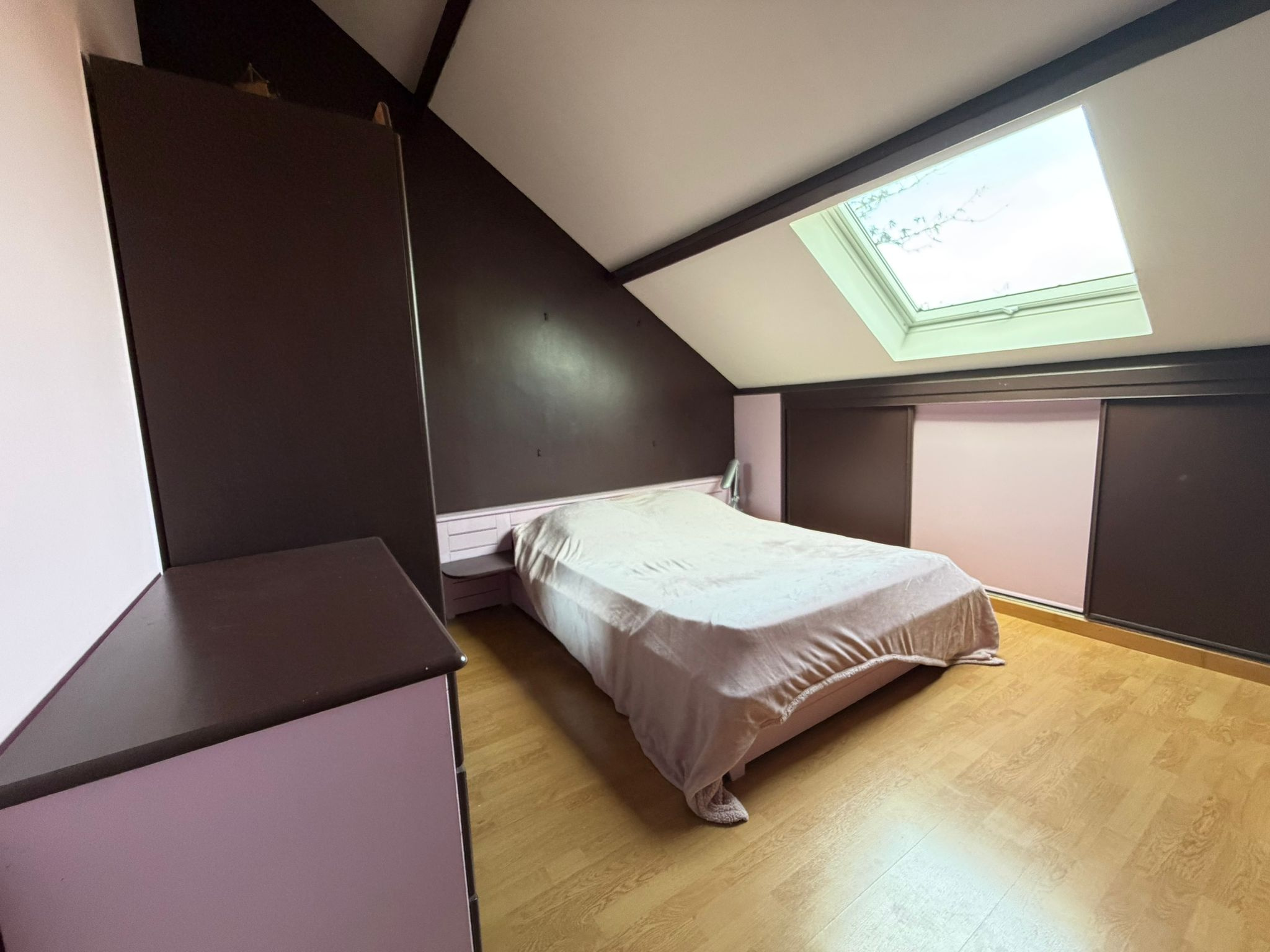 Sous sol divisé en vaste garage, buanderie/chaufferie, une chambre et placards.